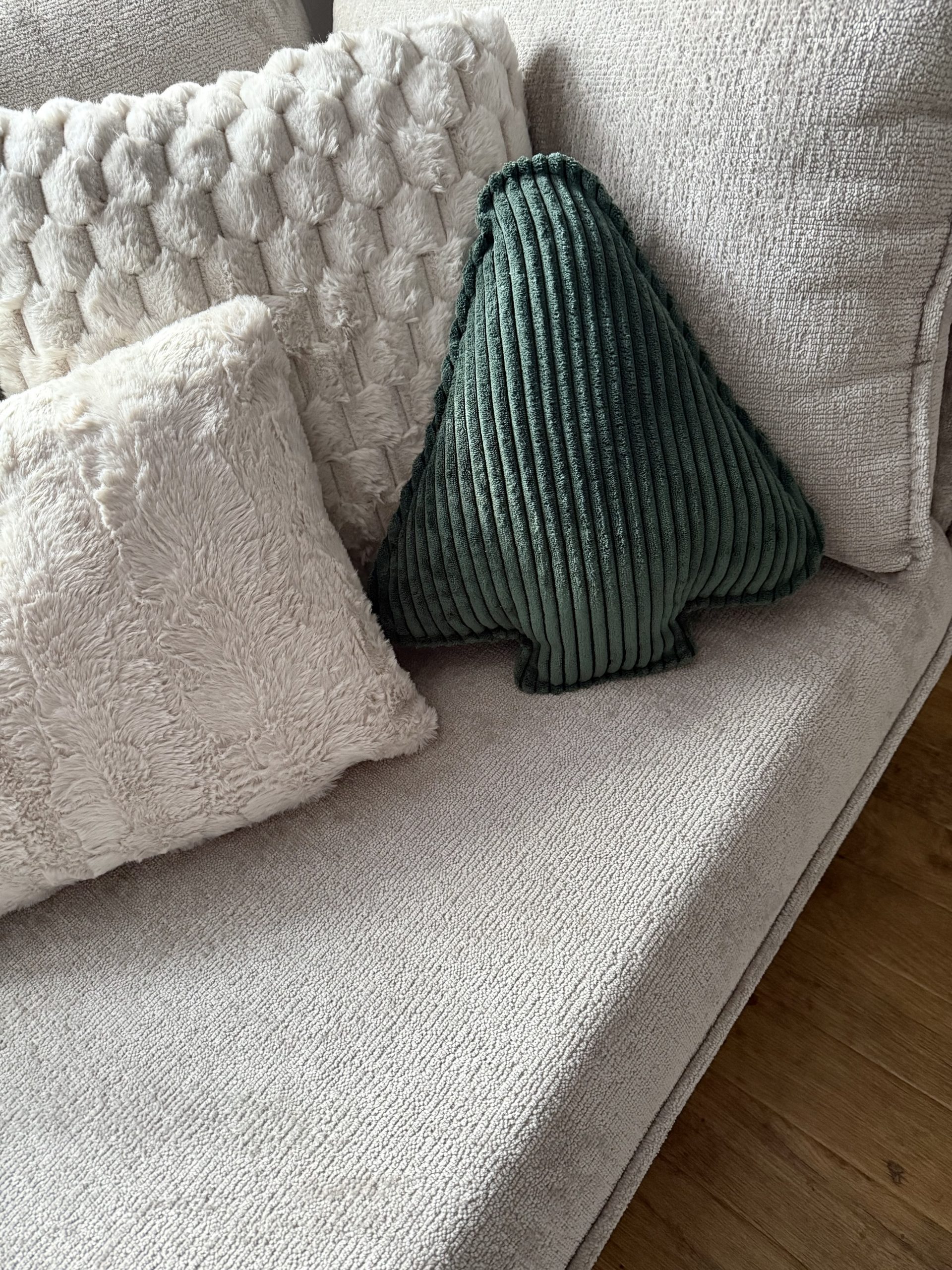 Ręcznie szyta poduszka świąteczna w kształcie prostej choinki ze sztruksu. Miękka, trwała i stylowa dekoracja zimowa, która doda wnętrzu przytulności i świątecznej elegancji.