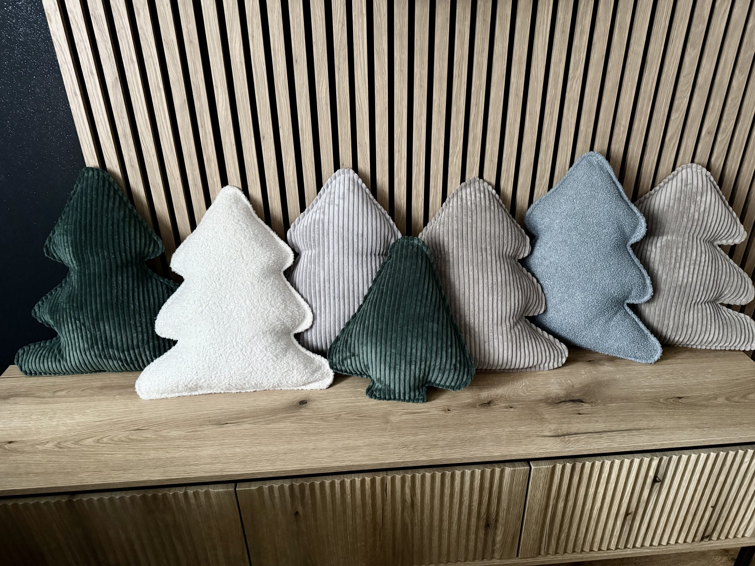 Ręcznie szyta poduszka świąteczna w kształcie choinki z pętelkowej tkaniny boucle. Miękka, trwała i stylowa dekoracja zimowa, która doda wnętrzu przytulności i świątecznej elegancji.