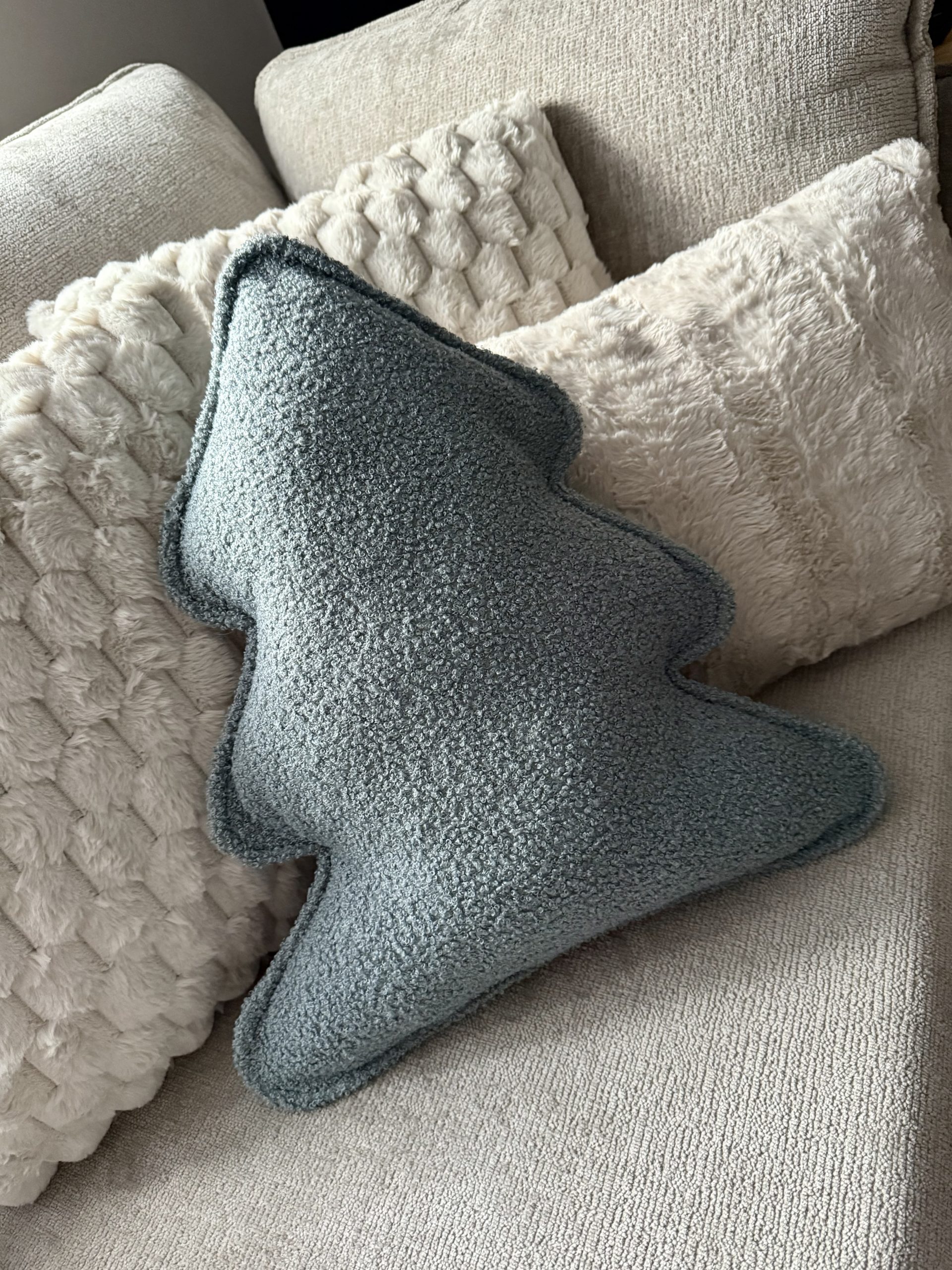 Ręcznie szyta poduszka świąteczna w kształcie choinki z pętelkowej tkaniny boucle. Miękka, trwała i stylowa dekoracja zimowa, która doda wnętrzu przytulności i świątecznej elegancji.